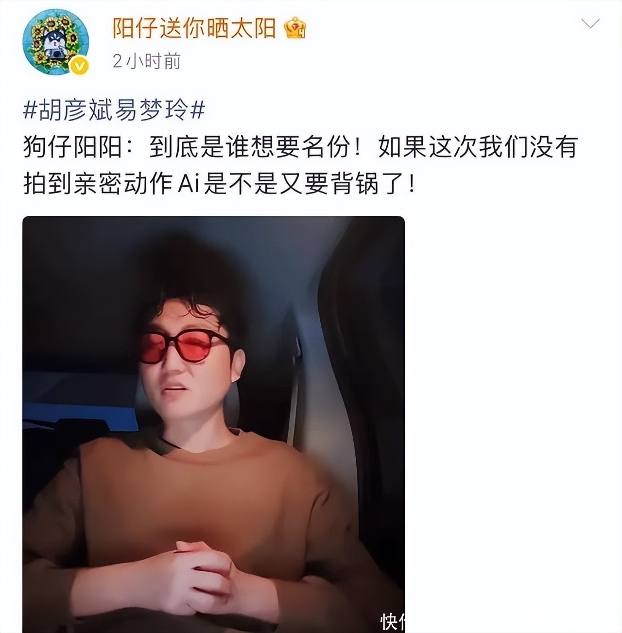 阳阳原本计划11月底放素材,因第三方提前泄露马尔代夫视频被迫曝光乌镇片段。质疑恋情曝光主动性,胡彦斌对恋情讳莫如深,这次是被实锤后被迫承认,若无视频发酵大概率继续隐瞒。晒拍摄花絮,角度专业画面稳定,非路人拍摄,印证女方或第三方推动曝光。不光马尔代夫海边照,此前偶遇同框照片都不是网友偶遇,疑女方刻意找人拍。喊话胡彦斌易梦玲是否看到拍摄素材,才一人用AI否认,一人又否认AI。