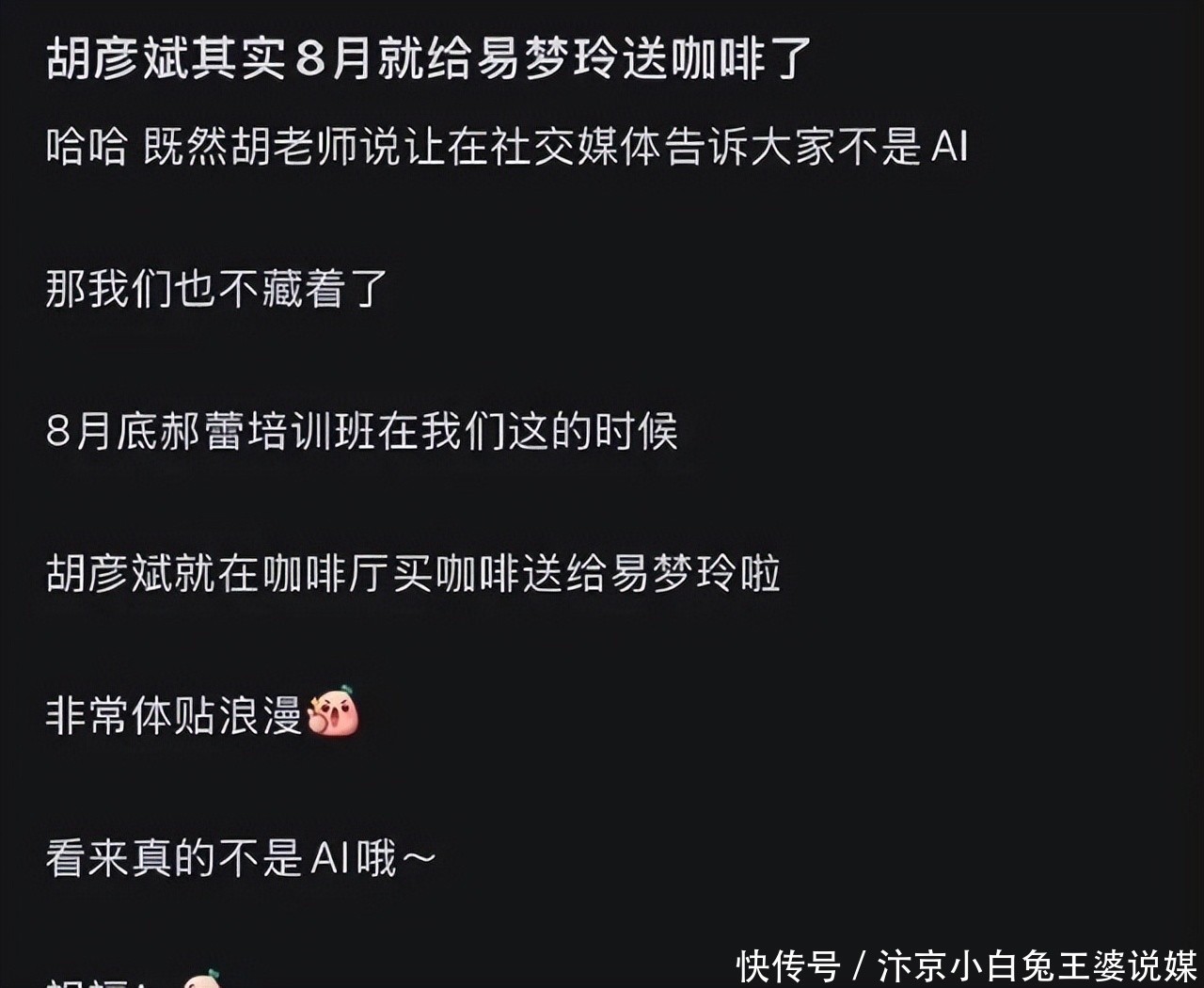 爆料博主张铁牛2025年11月21日晚发布长文,晒出聊天记录和照片,表明胡彦斌在与易梦玲交往期间,还与网红王阿哩保持恋爱关系。今年5月20日,胡彦斌飞往成都与王阿哩共度情人节,在高端民宿同居3天,王阿哩在朋友圈晒胡彦斌送的玫瑰和奢侈品项链,配文520的浪漫,后删除。8月胡彦斌已开始为易梦玲送咖啡示好,9月与王阿哩断联,存在时间线重叠。王阿哩朋友证实两人恋情,5月共度520,该言论已被胡彦斌工作室否认属虚假信息。8月胡彦斌与易梦玲已超甜。并非好聚好散。